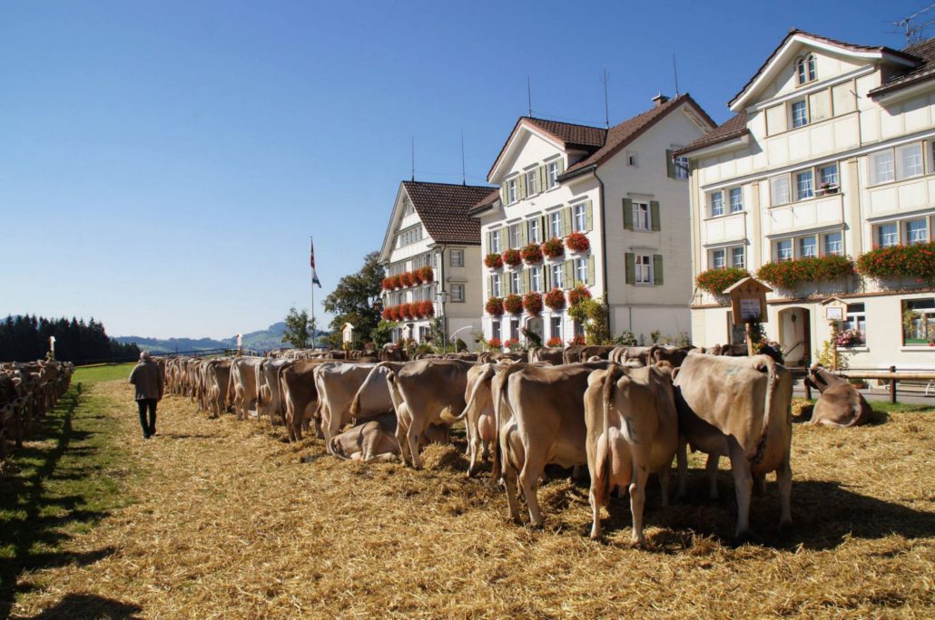 In 1798 the Prussian traveler Johann Gottfried Ebel visited the Appenzell and was impressed by the care with which the farmers raised their cows.  He marveled at how well-fed, healthy, and shiny the animals were.  Though the traditional dairy farm with cows, goats, and sheep is still the norm, there are many other types of farms here: farms that raise different kinds of livestock (Kobe type beef, Llamas) and organic (livestock and vegetable) farms, for instance.  The economy of the Appenzell is no longer based primarily on agriculture, as it was for hundreds of years, but agriculture is a primary contributor to the beauty of the landscape and to the traditions which make this such a special place.